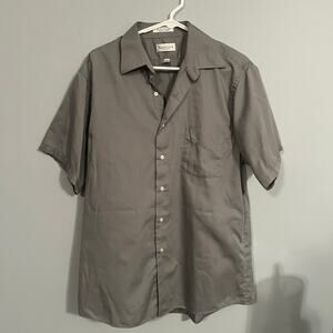 Van Heusen Gray Lux Sateen Button Down Shirt in men's Size Large 16.5 / 32 - 33. Regular fit. Wrinkle free. Short sleeves. Shirt is in very good used condition with no flaws or stains and minimal wash wear. Please see close-up pictures for condition details. Pit to pit measures approx 24 in across and length from top of front shoulder to bottom hem measures approx 29.5 in.