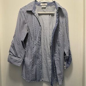 Shirt should for a size 8/10. Buttons to keep sleeves up, sleeve 18, length 26. Open weave blue sweater comes with. Will add photos later.