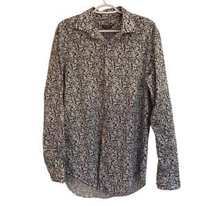 Stylish Van Heusen men’s long sleeve button-down shirt in size 16 34/35, featuring a subtle blue floral print on a crisp white background. Crafted from lightweight, breathable fabric with a smooth texture that offers comfort and easy care. Includes a pointed collar, button cuffs, and a classic fit perfect for business casual, dinner outings, or weekend wear. Excellent pre-owned condition—no stains, holes, or fabric wear.