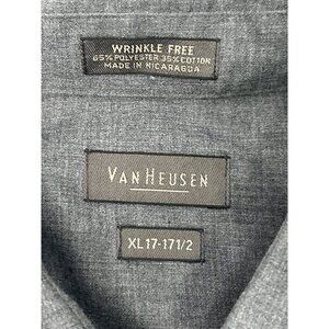 This Van Heusen Shirt in gray is tailored for men size 17-17.5. It features a classic, contemporary design, making it perfect for corporate or casual wear. The shirt is made from a comfortable blend of polyester and cotton.