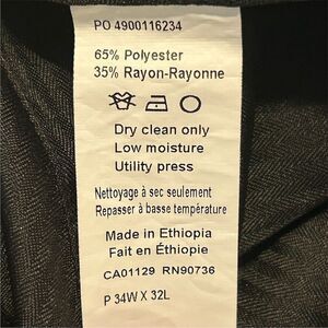 Van Heusen men's dress pants in a textured navy blue offer a regular fit with a 34-inch waist and 32-inch inseam. Made from a blend of polyester and rayon, these pants feature a flat front and a mid-rise, suitable for formal occasions. They have a solid pattern and a button closure. Manufactured in Ethiopia, these pants require dry cleaning. The condition is pre-owned but excellent. Keywords: Van Heusen, dress pants, navy blue, men's formal wear, regular fit, flat front, polyester, rayon, mid-rise, button closure, solid pattern, Ethiopia, dry clean.