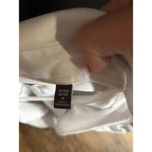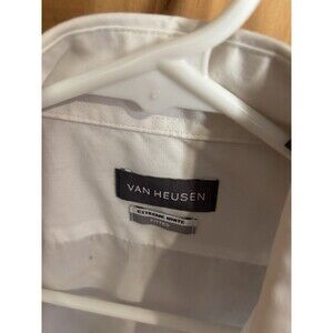 The Van Heusen Men's White Long Sleeve Dress Shirt in size 15.5 is a classic and versatile addition to any formal or business wardrobe. Made from a comfortable cotton blend with a solid white color, this shirt features a collared neckline, long sleeves, and a button closure. The regular fit and stretch fabric make it easy to wear and move in, while the barrel cuff adds a stylish touch. Machine washable for easy care, this shirt is perfect for those looking for a timeless and professional look.