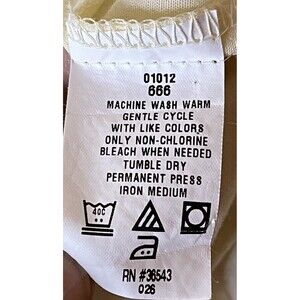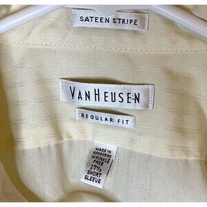 1 Pre owned Van Heusen Men's XL 17.5 Yellow Sateen Stripe Regular Fit Short Sleeved Button Down Shirt. Made in Honduras. 75% Polyester & 25% Cotton. Machine washable, tumble dry low.