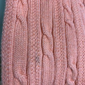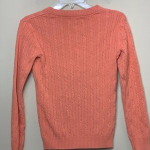 This adorable lightweight sweater is perfect for transitioning into spring! Sweater is in good condition other than a small stain on the back of the left sleeve. (See Pictures).