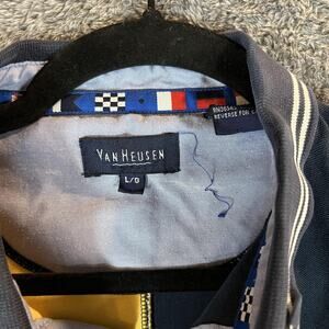 Embroidered Van Heusen branding on the neckline, multicolor nautical flag pattern trim inside collar.