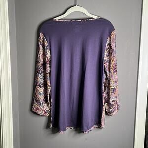 This brand new Van Heusen purple paisley print top with half sleeves in size small is a stylish and versatile garment that combines a captivating print with a comfortable and flattering fit. Rounded neckline.