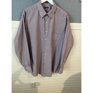 Van Heusen Regular Fit Wrinkle Free Plum Plaid Collared Dress Shirt Size 17 1/2