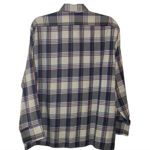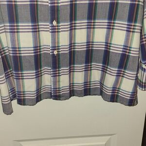 Van Heusen Sports wearens plaid button down shirt in a size large. Made of a cotton and polyester blend. Long sleeved. Purple pinstripe plaid design. Excellent condition.