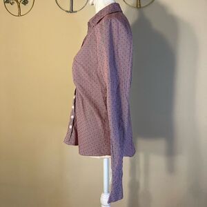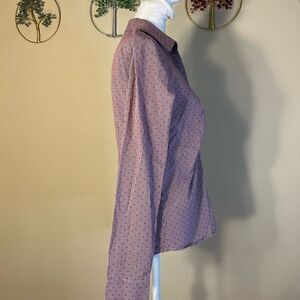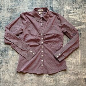 Long sleeve button down shirt with a berry colored pin check pattern throughout. Buttons start a bit lower creating a v neck neckline. Ruched detail at center gives it an interesting but not overwhelming feature.