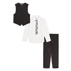 *4-piece boys suit set with dress shirt, tie, vest, and pants.