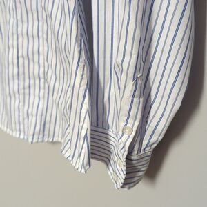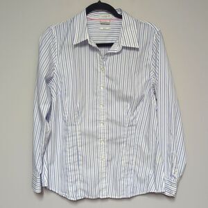 White, blue striped, button down blouse. Fitted look. Button closure on wrists