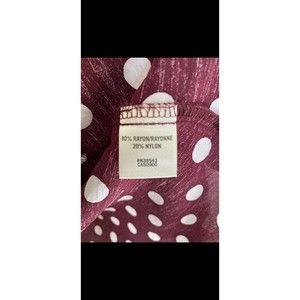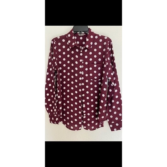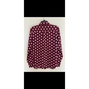 Van Heusen Deep Wine/Maroon color button down blouse with creamy-white polka dots. White buttons down body and on cuffs. One One Pocket design on right side of chest, fabric has a natural crinkle aspect to it. Size medium. 80% Rayon and 20% Nylon. Great condition, no stains, holes, rips or tears. comes from a smoke and pet free home. Retails for $64 new