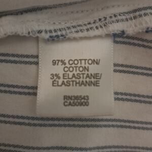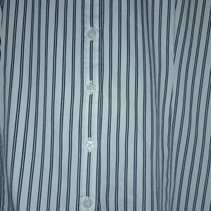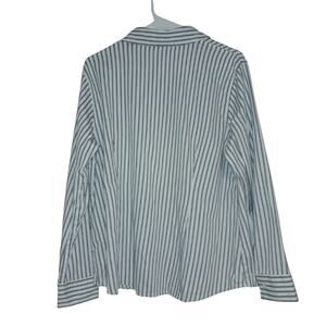 This Van Heusen women’s long sleeve button-up shirt is a timeless layering essential with a crisp, tailored look. It features a white base with navy blue vertical stripes—each set of blue stripes appears as two thin, parallel lines spaced slightly apart, repeated throughout the shirt. The contrast creates a refined, modern pinstripe look with wider white spacing in between for a clean, structured aesthetic.