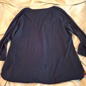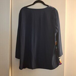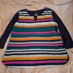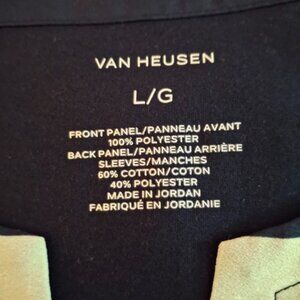 This relaxed-fit blouse from Van Heusen showcases a harmonious blend of blue and yellow tones, offering a chic and comfortable style with two front breast pockets. The silhouette and tunic length make it a versatile addition to any wardrobe, perfect for both casual and semi-formal occasions. Size Large. pit to pit measures 22 inches. Length 26 inches.