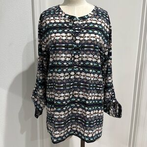 Van Heusen Women’s Rolled Sleeve Top in size Large. Sleeves are wrist length with a tab to roll them up. No visible signs of use or wear. No flaws. Please refer to photos for exact size, details, and condition.