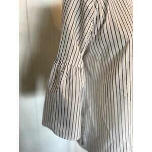 Van Heusen blouse in women's size medium. It is a blue Blue & White Pinstripe pattern on a cotton blend fabric (55% cotton / 45% polyester). The blouse has a v-neck line and bell sleeves.