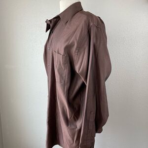 Classic and stylish brown button down shirt. It measures 25 inches across the chest laying flat and is 32 inches in length from shoulder to hem.