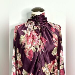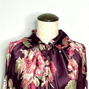 Beautiful floral 100% silk long sleeve blouse by Van Laack. Size 36 equivalent to US size small (see size chart attached). Buttons up front with high neck buttons. Can be worn with high neck or folder over traditional. Shown in pics both styles. VERY loose drapey fit. Quiet, refined luxury. Approx 28” across pit to pit and 29.25” shoulder to hem.