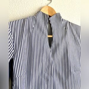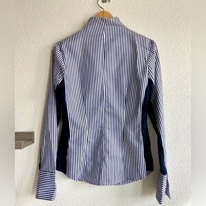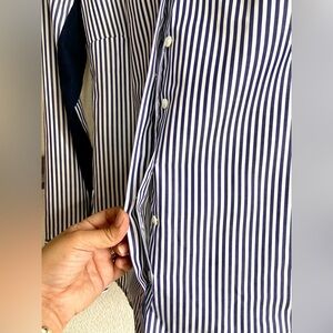 Striped top with buttons down front. Side panels have a little stretch. Material tag has been cut out but the fabric seems to be cotton. No size on top but would fit xs-s. PTP is 18 inches and the length is 26 inches. White and dark navy. 2 smaller stains on item as shown in last two pics.