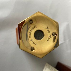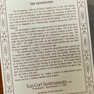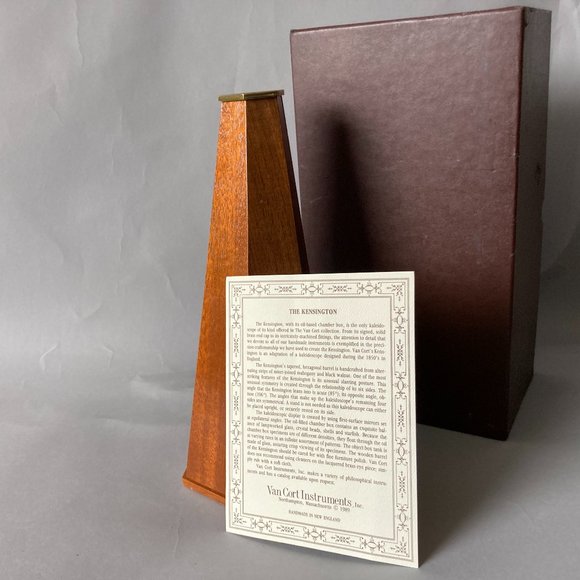 Van Cort Instrument Makers Wood&Brass Hexagon Kaleidoscope NEW IN BOX 5.0" W x 10.0" H x 5.0" D Kaleidoscope Hand Made by VanCort Instrument Makers. Hexagonal Wooden Pyramid Body, Brass Eyepiece with engraved makers details, filled with pieces of glass&small shells floating in transparent oil. In Excellent condition,optics are bright and clear, image is sharp.Despite never being used there is a ding in the wood. Please examine photos closely for exact condition.