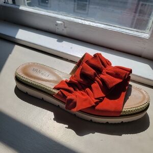 Summer, espadrille in orange suede, with ruffle embellishments, Size 9M. Perfect pop of color for your closet.