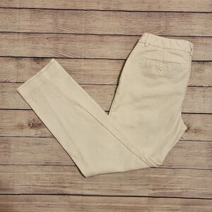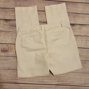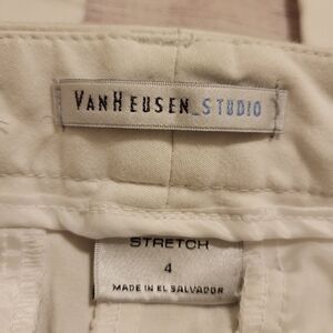 Van Heusen Studio white slim fit dress pants, stretch, size 4, 97% cotton 3% spandex, 4 pocket style design, 2 back pockets have button closure, 1 button/2 slip clasp/zipper closure, excellent condition.