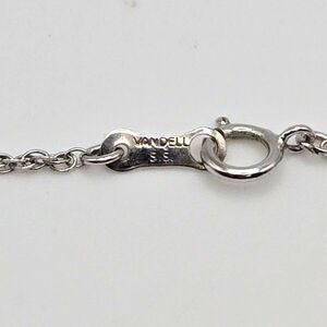 The Vandell Stainless Steel Chain Twisted Cage Freshwater Pearl Pendant Necklace is a stylish and elegant piece of jewelry. The pendant features a twist shape and a rolo chain, with a spring ring closure for easy wearing. The main stone is a cultured freshwater pearl, round in shape and white in color, set in stainless steel. The necklace is signed by Vandell and has a necklace length of 18 inches, making it a versatile and chic accessory for any outfit.