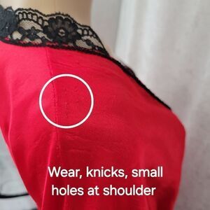 Flaws: 1 small pin hole on the backside of the Nightgown and wear on each of the shoulder seams like small holes / catches / thread pulls. Flaws are pointed out in photos.