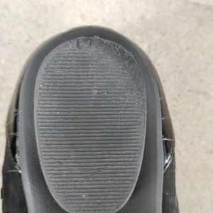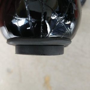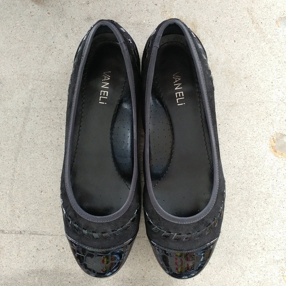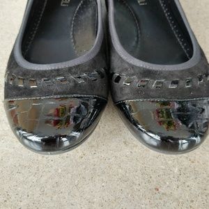 Black flats in a faux crock patten leather with suede as well. The color you see in any of the photos is a reflection from nearby flowers. There is slight wear on the heels as shown in the pictures