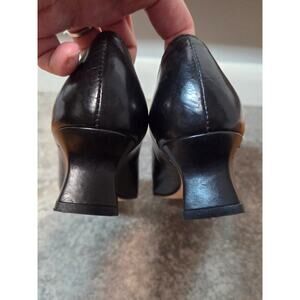 Style tags: classic black pumps, vintage heels, croc embossed leather, career office style, retro dress shoes