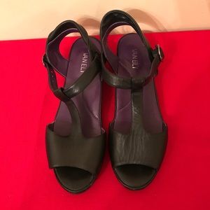 Black purple lined leather sandals. 1.5'' heel. Buckle closure. Cushioned footbed. Leather upper. Leather lining. Rubber sole