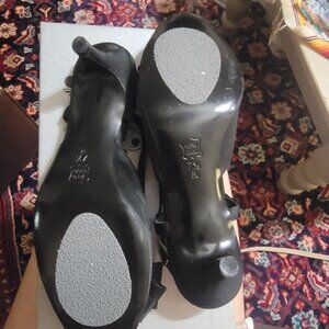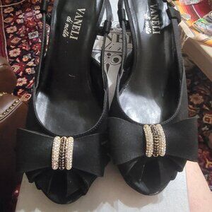 Stylish black satin shoes by Vaneli. Perfect for elegant occasions. Original Box and tissues from Italy. MINT Condition. There is not a single sign of wear on these Derrall Black Satin heels with Genuine Leather as the bottoms say "Vero Cuoio" the bow is elegant wuth glitzy white & black crystals in the center. The sling has a buck and the heels are perfect. The sole is soft and has cushion. Gorgeous!