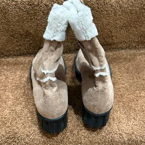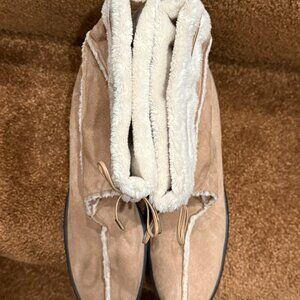Tan Suede Ankle Boot with Cream Fur trim and Leather tie a ankle.