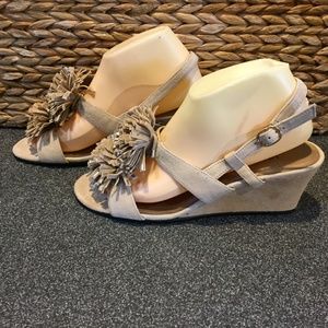 Vaneli suede "Laycie" tan wedge sandals with buckle closure and pom pom-like detail with silver shiny embellishments. The undersides of straps have peeling.