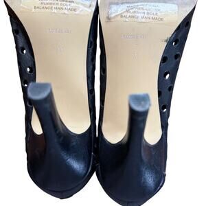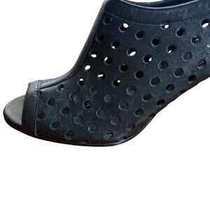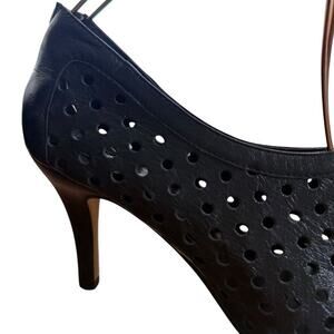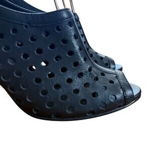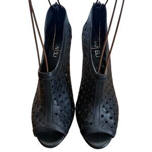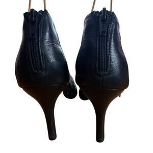 This Vaneli Van Eli women's high heel peep toe ankle bootie features laser cut-outs on the leather upper, providing a stylish and modern look. The shoe has a stiletto heel with a height of 3-3.9 inches, making it suitable for occasions like weddings, parties, formal events, and business settings. The black color, polka dot pattern, and peep toe design give it a fashionable and trendy aesthetic, perfect for the summer, fall, and spring seasons. The shoe is lined with synthetic material and has a zip closure for easy wear.