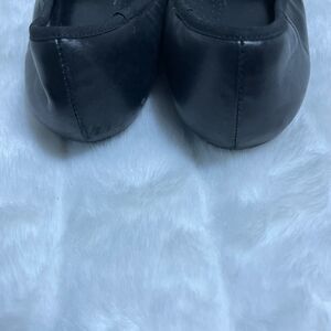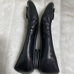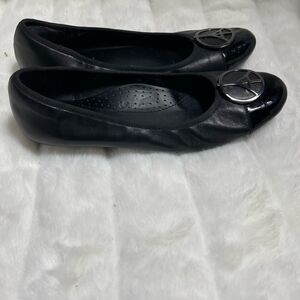 Vaneli black leather flats shoes round toe with a silver tone logo accent SZ9M pre owned in good used condition normal wear has one small peeling on the side of the left heel and small scratch on the right heel see all pictures any questions please message.