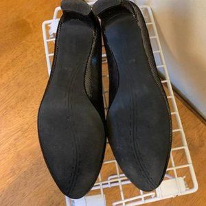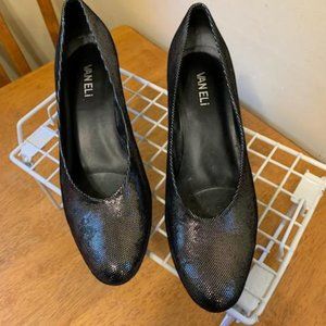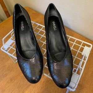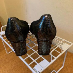 Glimmer like the night sky in this beautiful pump that features a reptile embossed leather upper and modest block heel. This pump pairs perfectly with trousers and a blazer for work or black skinny pants for a night out with the girls.