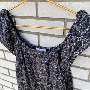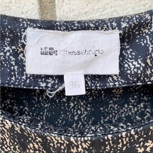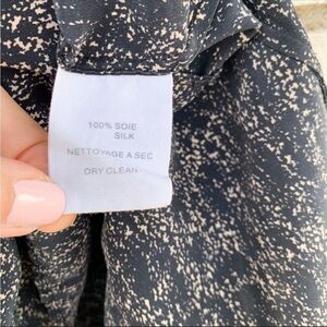 Ruffles at shoulders. Sleeveless. Unlined. Black and cream print throughout. Size 36 (approx a US size S/2-4). 100% silk. Excellent used condition.