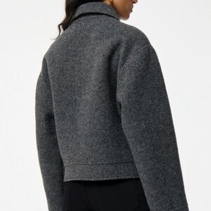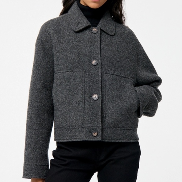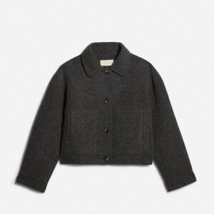 Elegant charcoal pea coat. Features classic button design. Ideal for cool weather.