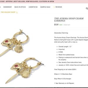 The Aurora Hoop Charm Earrings. The Aurora Earrings feature small gold hoops with a gold dipped dagger, shell and puffy heart with a ruby cz.