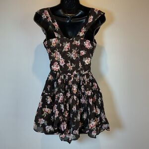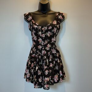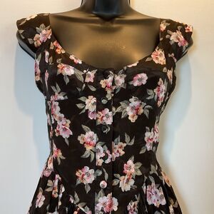 #Vanessa Mooney, Elisabeth romper, Elisabeth dress, floral romper dress, black floral mini, vintage rose print, romantic style, bustier mini dress, floral mini dress, coquette aesthetic, cottagecore, Y2K revival, 90s style, flirty mini, influencer fashion, L.A. boutique style, date night outfit, party romper, girls night outfit, spring summer outfit, brunch dress, feminine fashion, resort wear, vacation style, black pink floral, retro romance, festival fashion, Instagram outfit, model off duty, chic mini dress, romantic floral romper