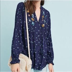 Vanessa Virginia Anthropologie Blue Long Sleeve Floral Jeweled Top Blouse 12