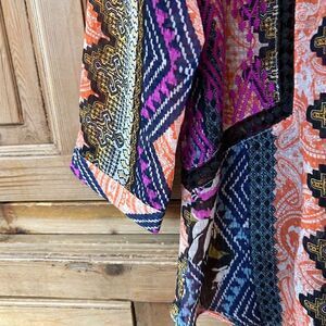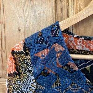 Features: Very cute blouse. Multicolored abstract patterns. Crewneck. Half button up. 3/4 Sleeve with buttons at ends of arms. Embroidered details at the shoulder.