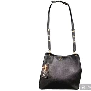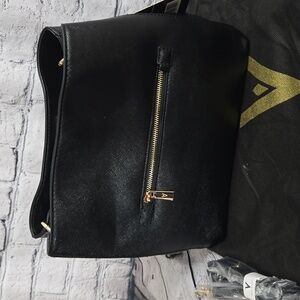 Medium size bag with lots of space inside. There is 1 back zipper pouch (exterior). There are 2 inside zipper pockets, one inside the middle of bag and the other inside back of bag. There are 2 separate compartments same as the length of the bag. Comes with original dust bag.