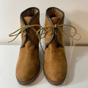 Anthropologie brown wedge boots with cute black trim. Size 7. Super cute shoes! Small imperfections on the suede. See pictures. Vanessa Wu