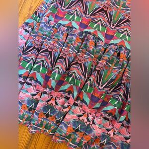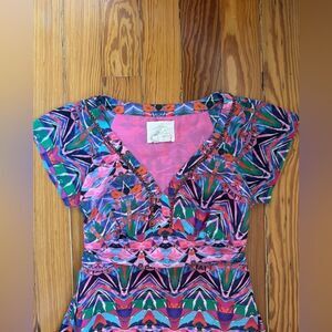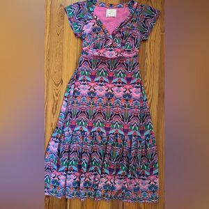 Lightly worn. Beautiful dress with bold colorful print. Beading along the neckline. Tie at waist. Small section where the stitching is coming undone (see photo). Size 4