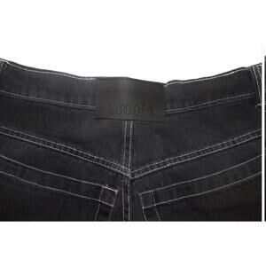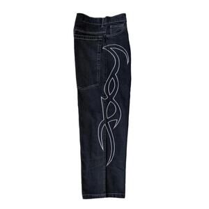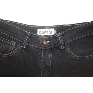 The Vaneta Jeans Embroidered Skater Black in size L offers a relaxed fit with a straight style and a 35-inch inseam. Made for men, these regular-sized jeans feature intricate embroidered accents in a sleek black color. With a waist size of 36 inches, this pair of jeans combines comfort and style for a versatile addition to any wardrobe. Perfect for those looking for a unique and eye-catching option in men's jeans.