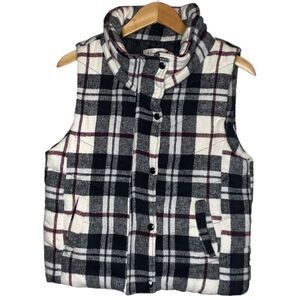 Vanilla Bay plaid puffer vest in black, white, and burgundy. Features a cozy quilted lining, snap button front, and stand collar for extra warmth. This sleeveless piece adds the perfect rustic touch to your fall and winter outfits — ideal for layering over sweaters or flannels for that preppy, outdoorsy look.