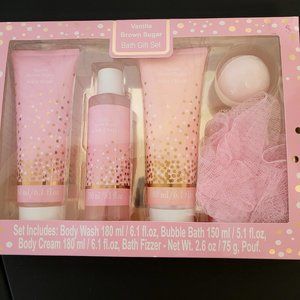 Vanilla Brown Sugar 5 Piece Set Body Wash Bubble Bath Body Cream Fizzer & Pouf