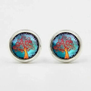 Vanilla Sky Tree of Life Art Glass Cabochon Round Silver Plated Stud Earrings
